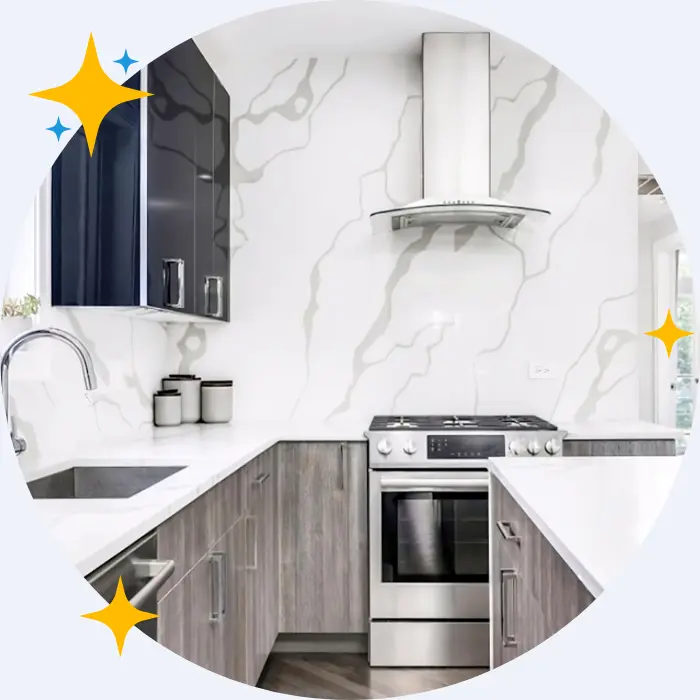 - In the kitchen, we clean inside and outside the refrigerator, oven, and microwave, clean cabinet exteriors, tiles, range hood, and disinfect bins.